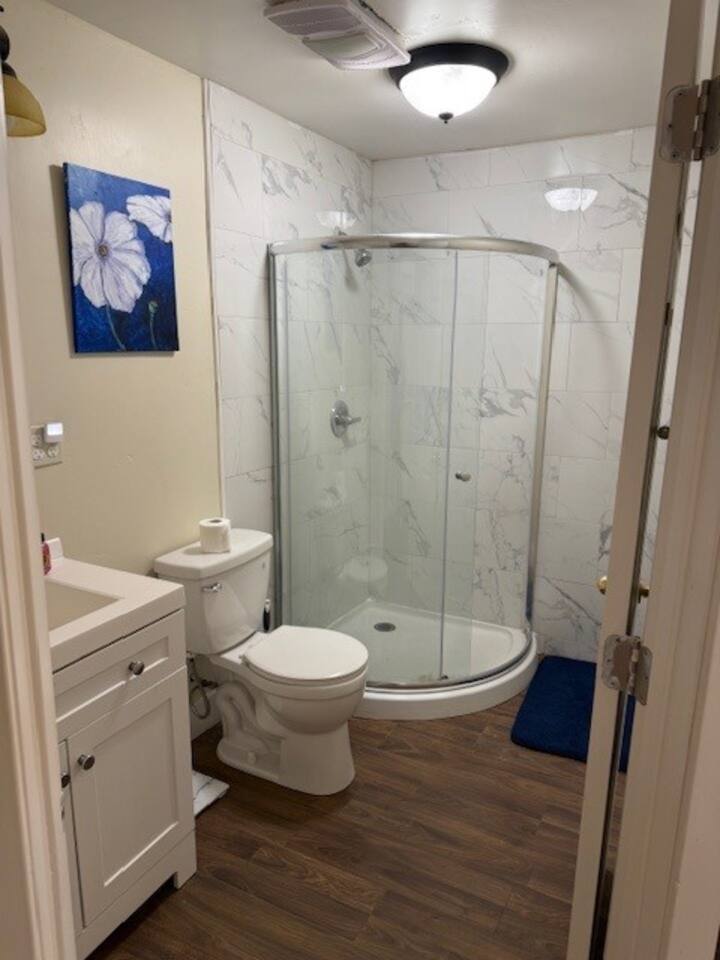 Our home is 1 of 8 tiny home located on 40 acres with farm animals nearby to pet and feed. Beautiful wide open views and spaces. Star filled nights. Camp fire and BBQ compatibale. Plenty of parking. King bed. Couch has a simple pull out bed. We usually have miniture cows, horses, goats, chickens (Free fresh eggs) and cats. You wouldn't know but we are 100% off grid with our own well and solar power.